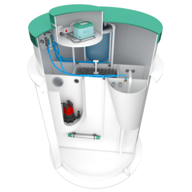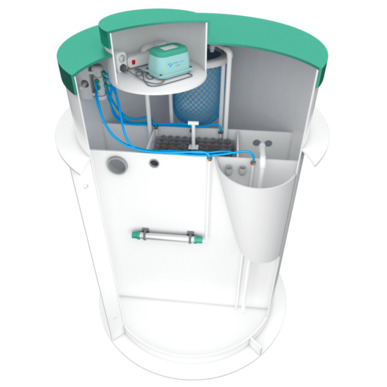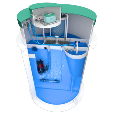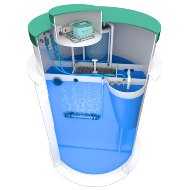Станция глубокой биологической очистки выполнена цилиндрической формы. Внутреннее пространство разделено на шесть отсеков и дополнительный отсек для сбора отработанного ила. На сегодняшний день это единственная установка, которая может работать без ассенизатора. То есть все иловые осаждения собираются в этом отсеке, в специальный мешок, который легко можно сменить на новый. Компрессорный отсек и электрические розетки расположены, как говорилось ранее, в изолированном блоке, благодаря чему септику не страшны переливы, компрессор навсегда останется сухим.