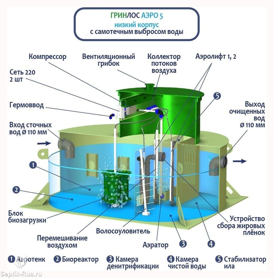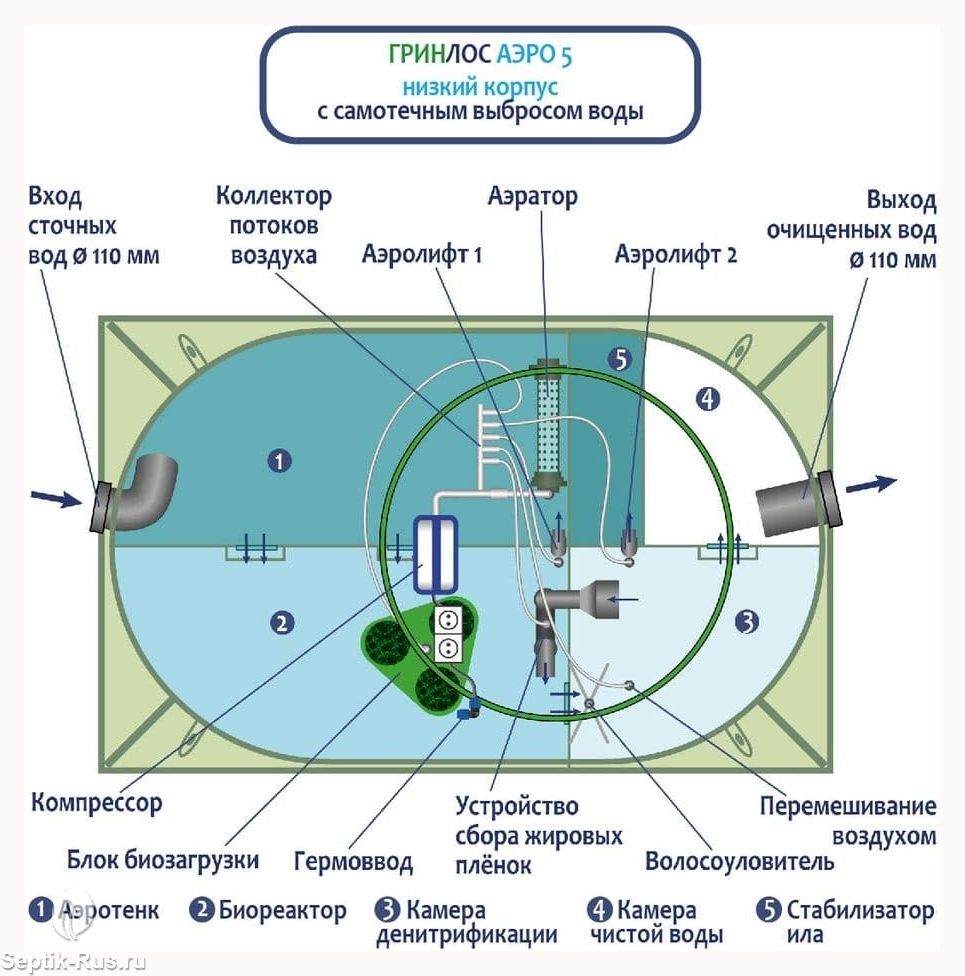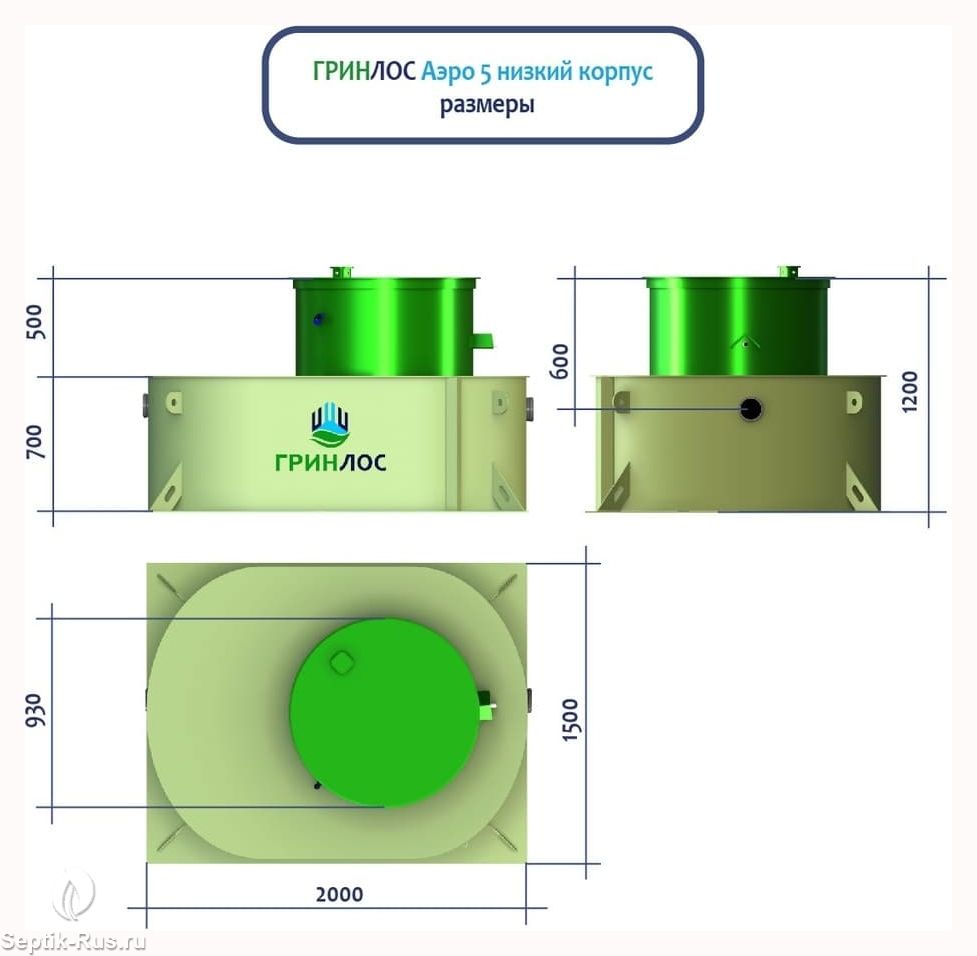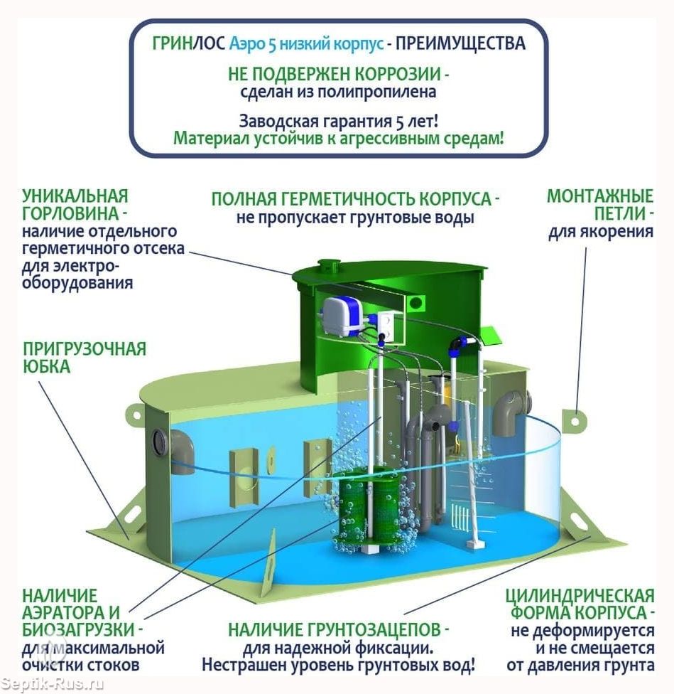 Отличительными особенностями септика ГРИНЛОС Аэро 5 низкий корпус являются: