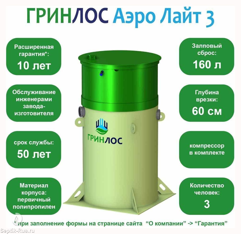 Септик Гринлос Аэро Лайт 3 изготавливается из первичного полипропилена. Корпус разделен на четыре отсека со специальными технологическими переливами. Перетекая из одной камеры в другую, стоки последовательно проходят процессы усреднения, аэрации, отстаивания, нитрификации и денитрификации, осветления, после чего выводятся в грунт принудительным или самотечным способом.