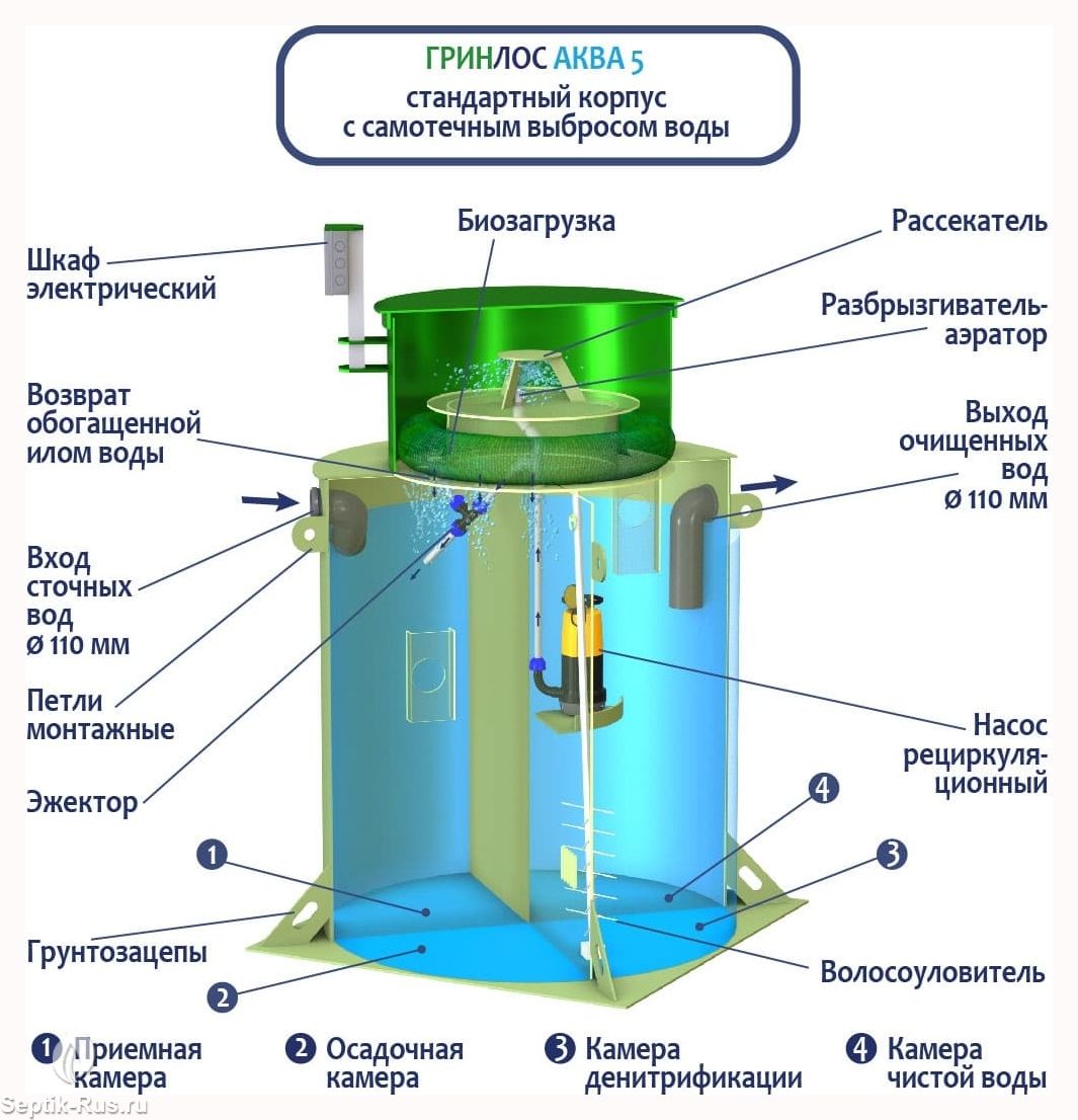 Процесс расщепления и переработки органических загрязнений происходят в результате жизнедеятельности аэробных микроорганизмов, условия для жизнедеятельности которых создает септик ГРИНЛОС Аква 5.