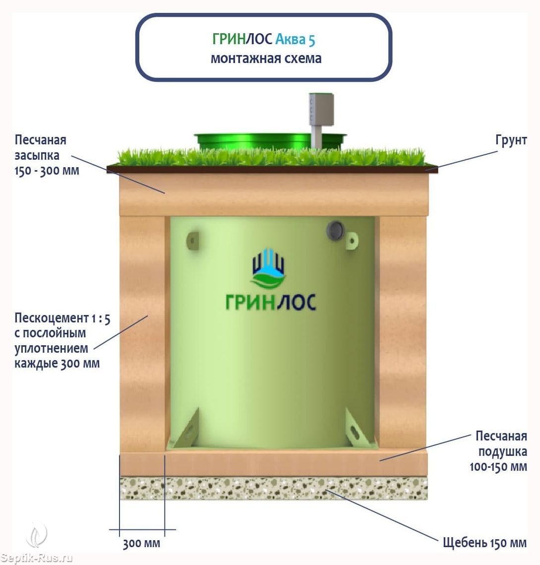 Перед непосредственным монтажом ГРИНЛОС Аква 5 специалисты осуществляют подготовку котлована. Его размеры определяются конструктивными особенностями выбранной модели оборудования.