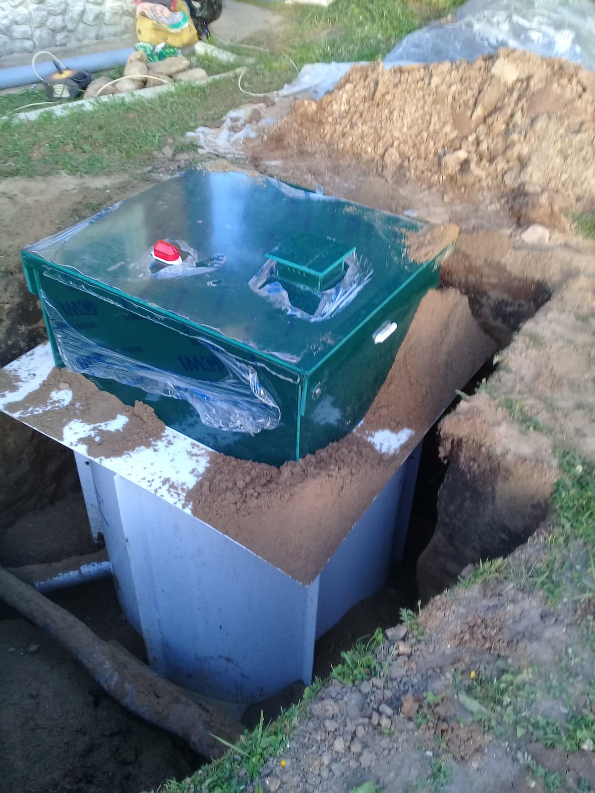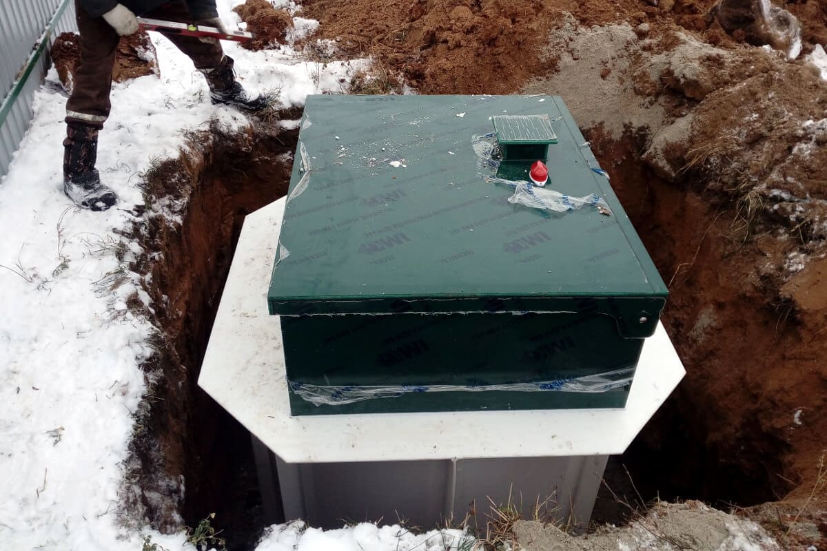 - Корпус септика Волгарь устанавливается вертикально по центру котлована так, чтобы оставался зазор для обратной засыпки. Производится проверка с помощью уровня. Крен не допустим!